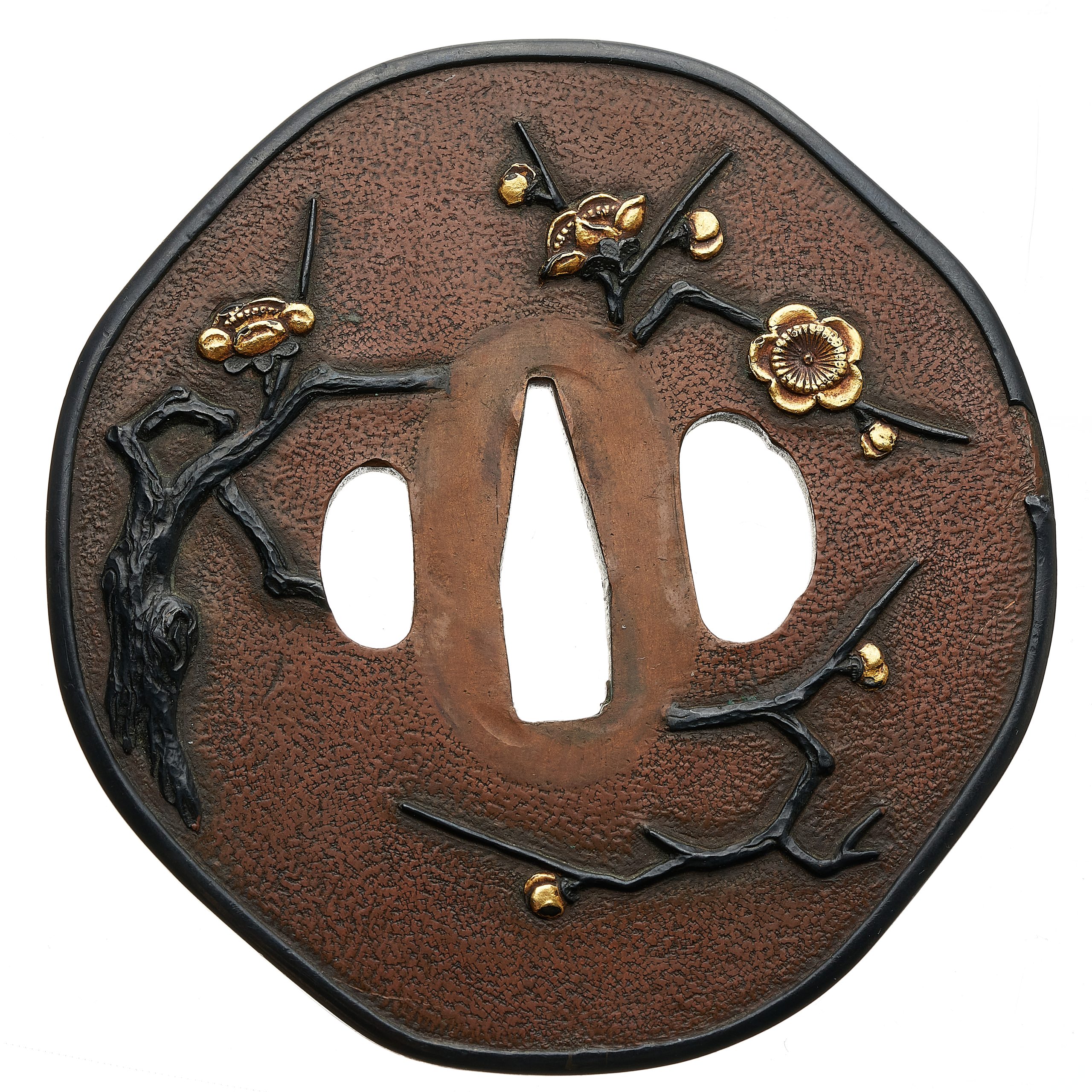 Kyo Shoami Tsuba with motif of old Gnarled Plum Tree and Blossoms.Copper with Shakudo and gold Flowers