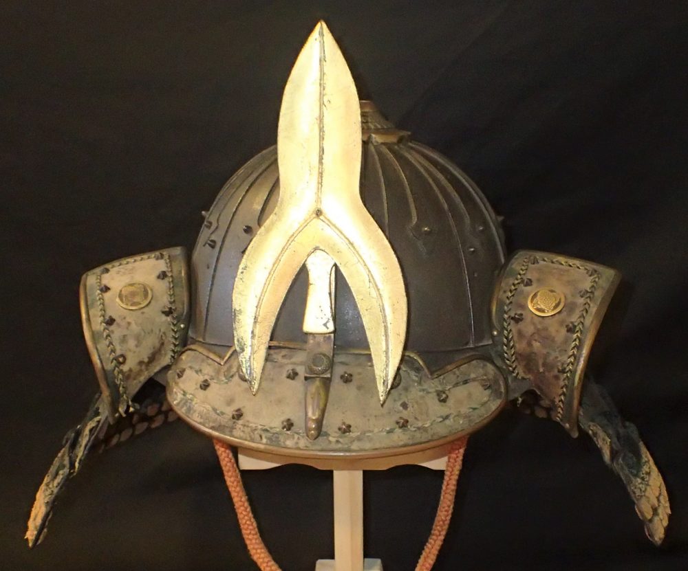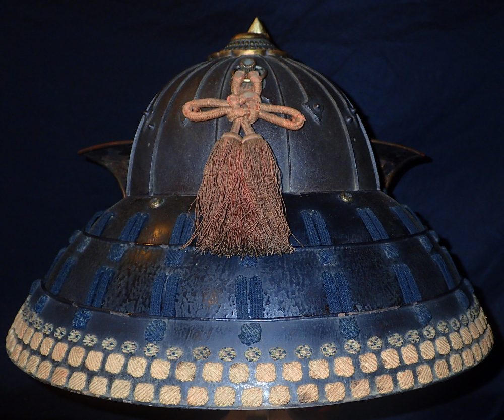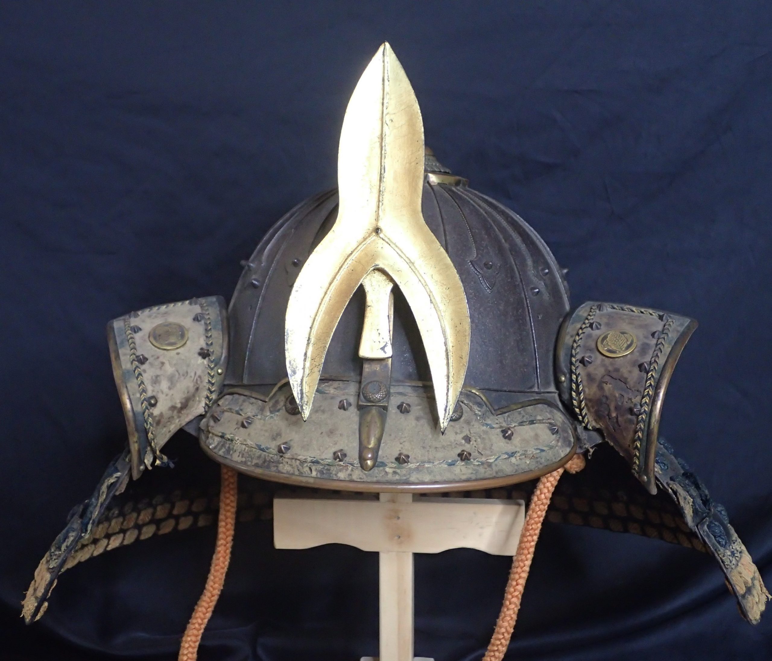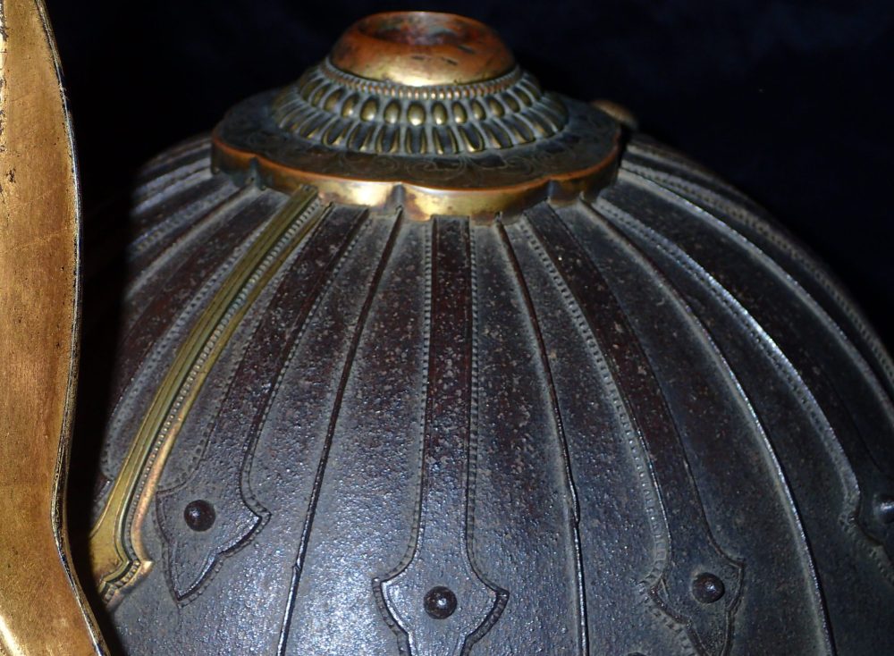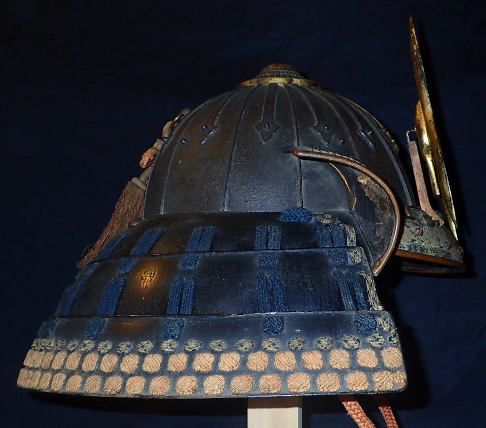 筋兜) – “Iron 12-plate ridged helmet in russet finish and with